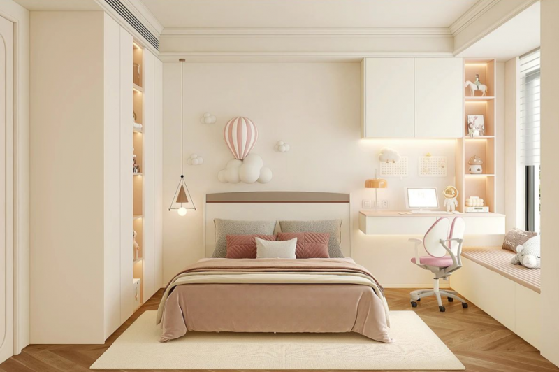 粉色与奶油感配色,温柔又梦幻。靠窗定制吊柜与书桌,提高空间利用率。飘窗做可收纳设计,铺上软垫打造休闲区,方便父母伴学。