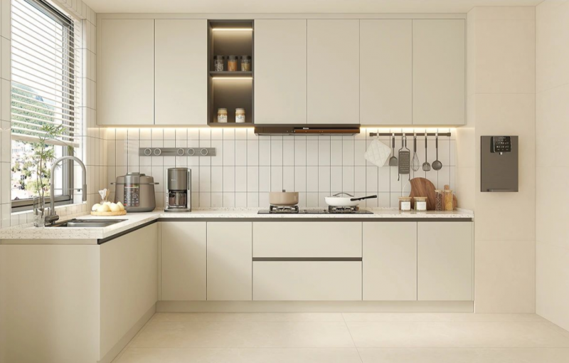 厨房配色和谐简约,橱柜采用橄榄灰门板,视觉柔和淡雅。L型布局舒适,洗、切、炒动线流畅。可移动滑轨与厨具上墙设计,让日常烹饪更加高效。