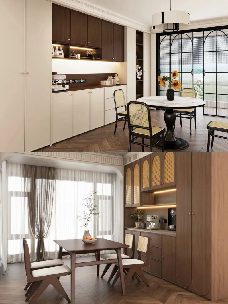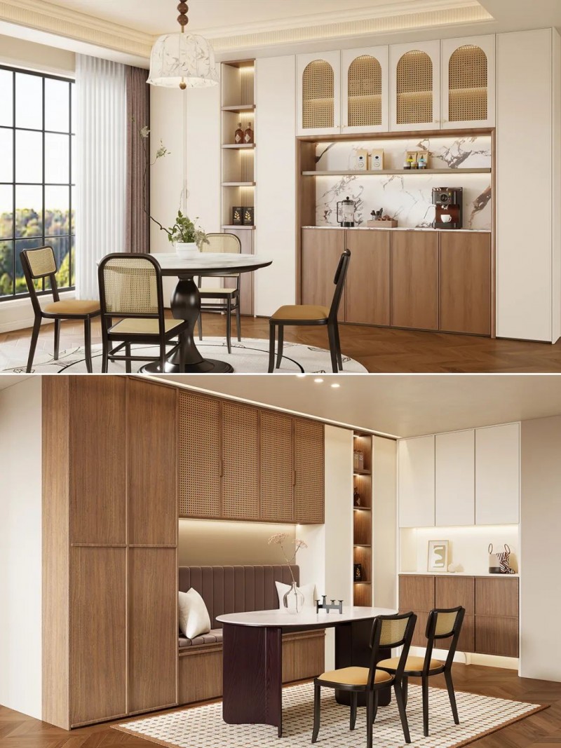 选用藤编门或有骨骼线的柜门设计,让空间更有立体感与层次感,同时增加复古气息。