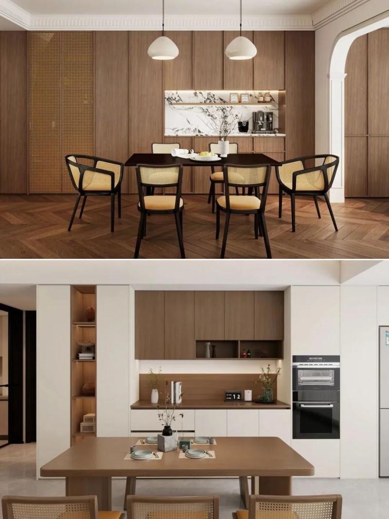 经典纯色+木色搭配,浅色作为大面积柜门,木色作为点缀或柜体,营造立体视觉效果。根据家居风格灵活调整配色,与墙面、地板颜色相协调,确保整体和谐统一。