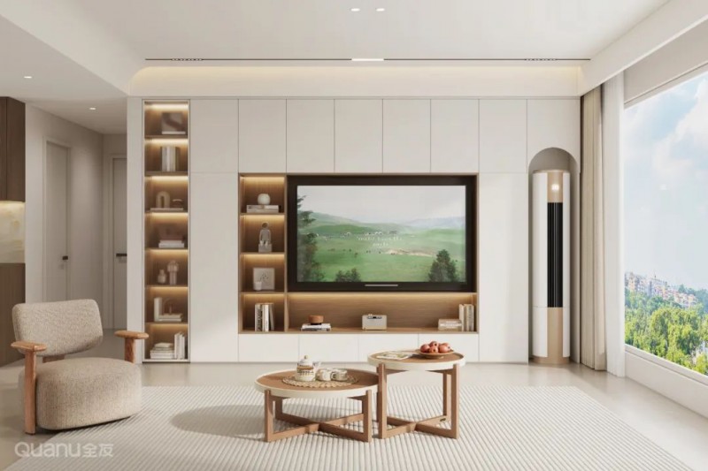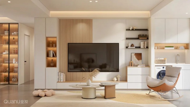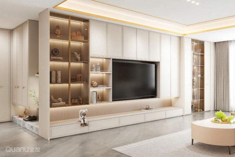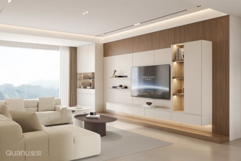 通常固定在新砌墙体或非承重墙上,且墙体需做加固处理。柜体深度由电视厚度及安装、储物需求而定,一般在35cm左右即可,搭配隐形拉手或无拉手柜门,通行防刮蹭,视感更简洁,与极简风、现代风等装修完美适配。Ps.为确保嵌入式电视柜能完美嵌入墙体,建议墙面做找平处理,定制时还需多次复尺以降低误差。
