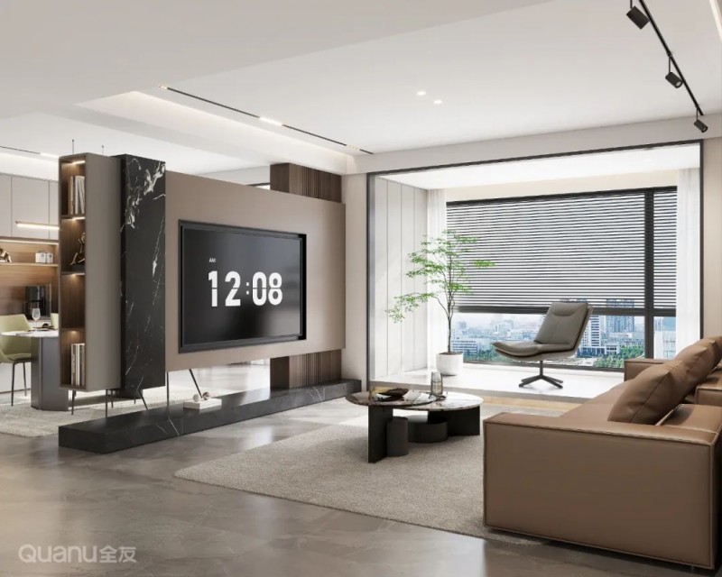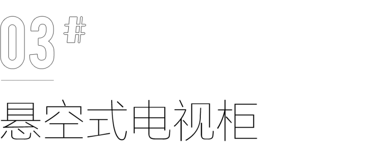 悬空式电视柜也常用作客厅隔断,电视机嵌入柜体,将区域一分为二,结合办公、娱乐等功能,为业主满足更加多样化的需求和体验。