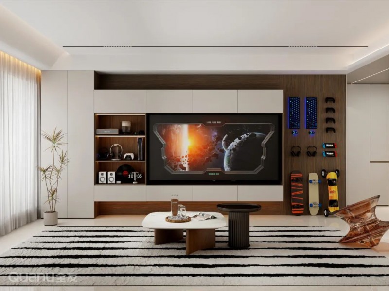 或是布置音响系统,专设电器、乐器、游戏等存放区,不仅能避免线路杂乱无章的问题,还能增进家庭温馨和谐氛围。