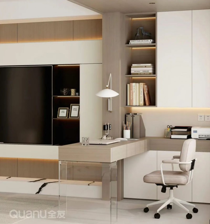 例如电视柜+转角桌面充当临时办公区,解决户型中缺少书房的难题。