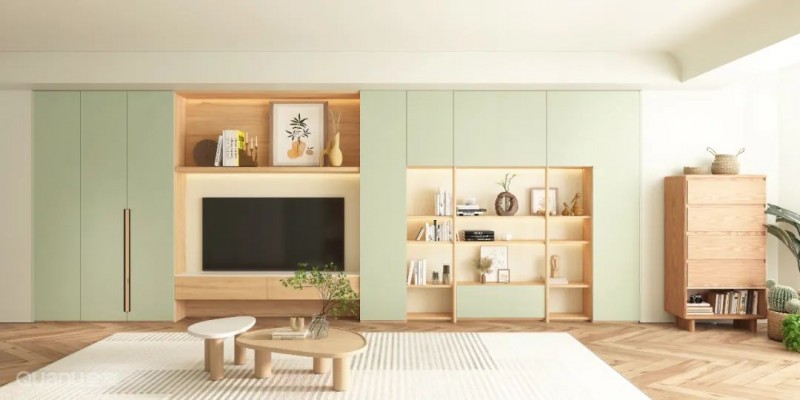 集展示、收纳于一体,做L型、C字型或满墙设计。结合抽屉、高/矮柜、开放格等多种形式组合,不仅储物空间大,能有序存放各种生活用品与书籍摆件,还可作为电视背景墙,为客厅增添一道亮丽的风景线。