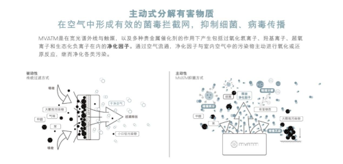 MVATM技术的核心优势在于其净化因子的产生与作用机制。在宽光谱外线与触媒以及多种贵金属催化剂的作用下,该技术能够产生过氧化氢离子、羟基离子、超氧离子和生态化负离子等净化因子。这些净化因子通过空气流通与室内空气中的污染物主动进行氧化或还原反应,从而净化各类污染。此外,该技术还能主动式分解有害物质,在空气中形成有效的菌毒拦截网,抑制细菌、病毒传播。