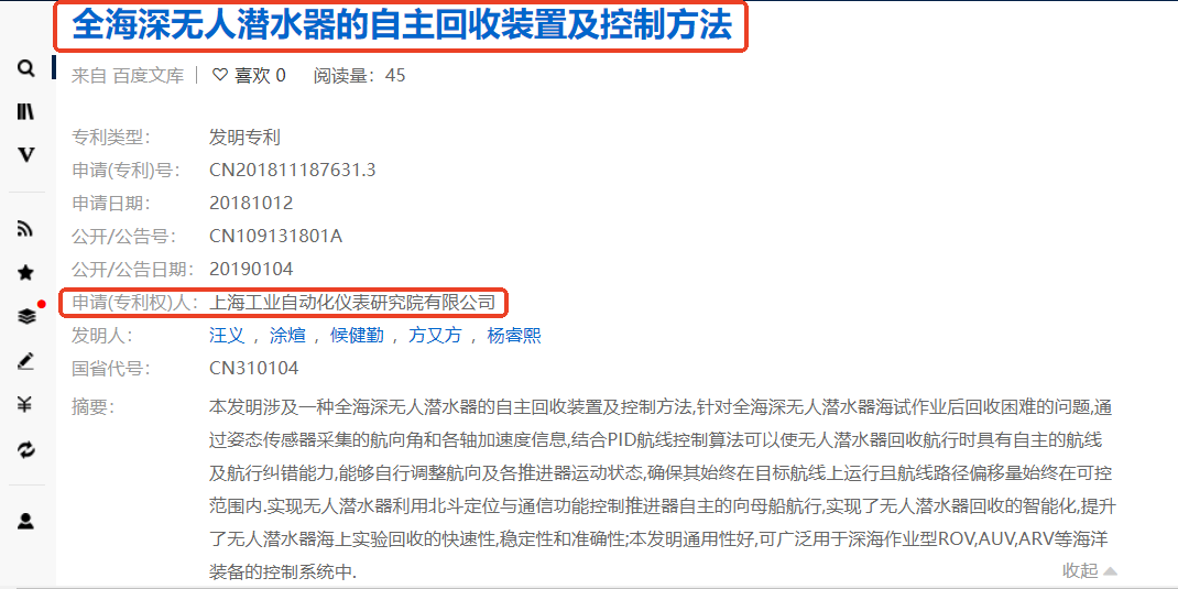 公开资料显示,作为飞乐音响(600651)的全资子公司,上海工业自动化仪表研究院有限公司早在2019年就申请通过了“全海深无人潜水器的自主回收装置及控制方法”相关发明专利。