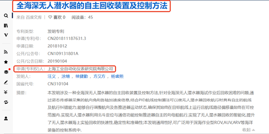 公开资料显示,上海工业自动化仪表研究院有限公司早在2019年就申请通过了“全海深无人潜水器的自主回收装置及控制方法”相关发明专利。