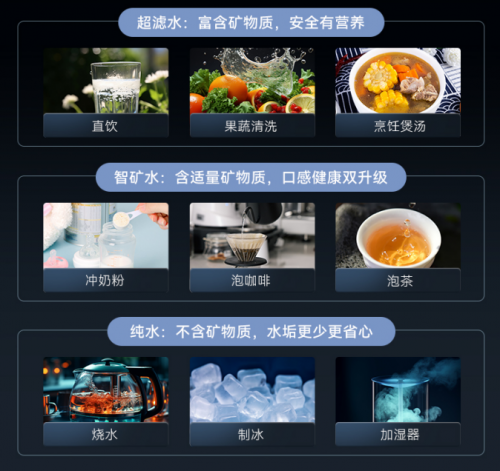此外,喜欢烹饪、用来直饮或者果蔬清洗的,可以选用超滤水,它富含对人体有益的天然矿物质,可以为家人提供安全有营养的饮用水,煲汤更滋养;纯水因为不含矿物质,纯净无杂质,适用于烧水、制冰或加湿器使用,减少了产生水垢的烦恼,提升了生活品质。