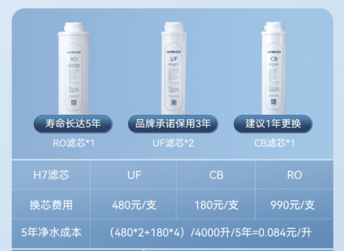 而经实际考察,该机型在线下的官方售价为6990元,按5年使用周期算,年成本为1398元,日均3.8元。再考虑使用期间会产生的换芯费用:2支UF滤芯,每支480元;4支CB滤芯,每支180元,5年使用时间里换芯,一共会花费1680元,日均0.94元。这样合计来算,购置立升智矿净水器H7日均总成本不足5元,较桶装水有不小幅度的降低,更何况这还没算上国家补贴至高20%的优惠。这种"一机三用"的设计不仅实现家庭用水的定制化,更从根源解决饮水安全问题,保留水源地的天然矿物质,让每杯茶都香醇饱满,每滴水都安全健康。