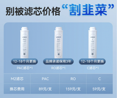 接下来可以看看它的使用成本。立升厨下RO净水器M2目前京东官旗的定价是738.9元,以3年为期(RO滤芯承诺保用3年),一年大约246.3元,每天净水器成本仅为0.67元。若叠加换芯费用,PAC滤芯(89元/支)和C滤芯(59元/支)3年下来各需要更换1-2次,按最多的2次算,3年滤芯费用总共为296元。滤芯和净水器费用相加,均分到每天都不用1元。而这样1元不到的花费,便足够保证多口之家日均10L的用水量,并且水质稳定可控。如果近期选择入手,还能享受到国家补贴85折的优惠,对比之下无疑更香了。