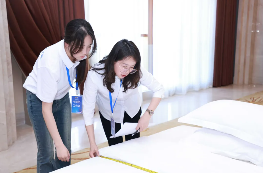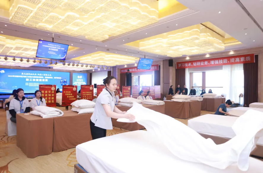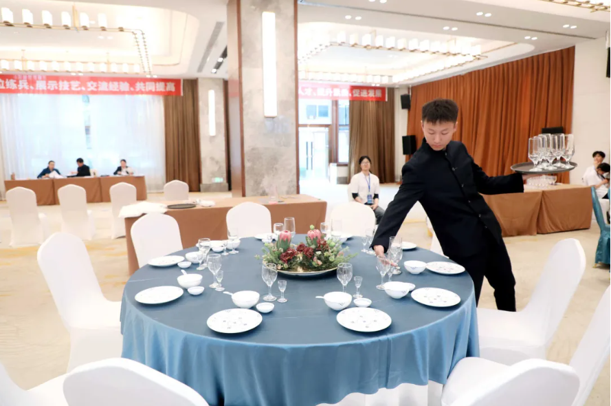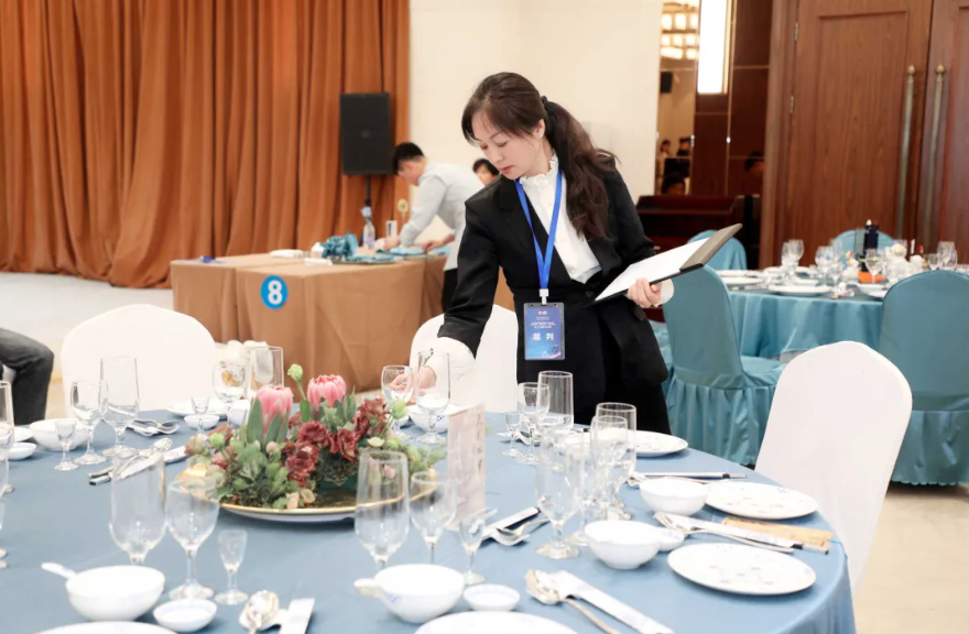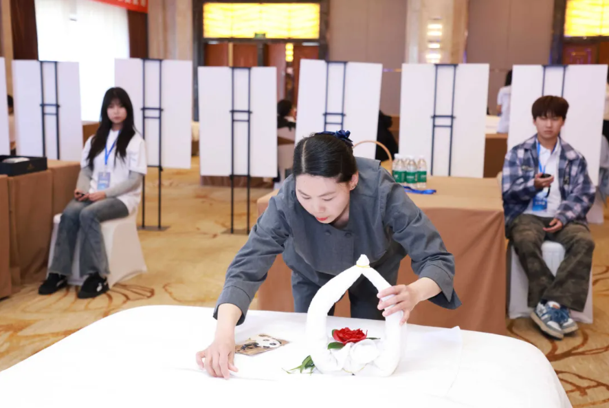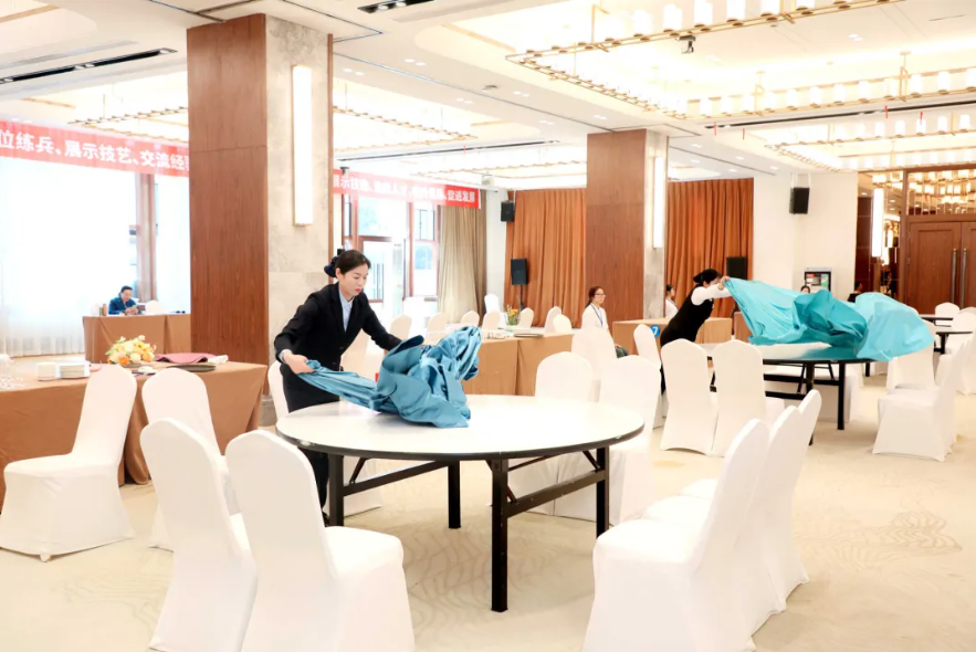客房服务员双手如飞,中式铺床迅速且规范,创意夜床服务独具匠心,答辩时对环保、创意理念阐释精妙。餐厅服务员从餐具摆放、餐巾折花到整体布局,精心布置中餐主题宴会摆台,对宴会接待流程、食品安全等专业知识对答如流。