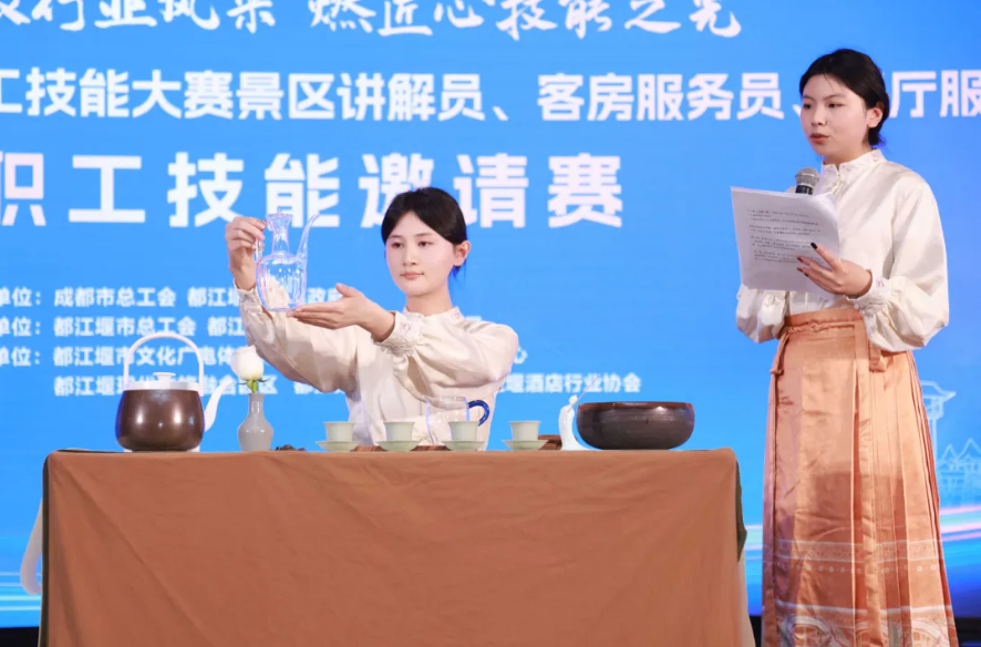 本次大赛由成都市总工会、都江堰市人民政 府主办,设置景区讲解员、客房服务员、餐厅服务员3个竞赛项目,从规范操作、文化内涵等方面全面考验选手的专业技能。