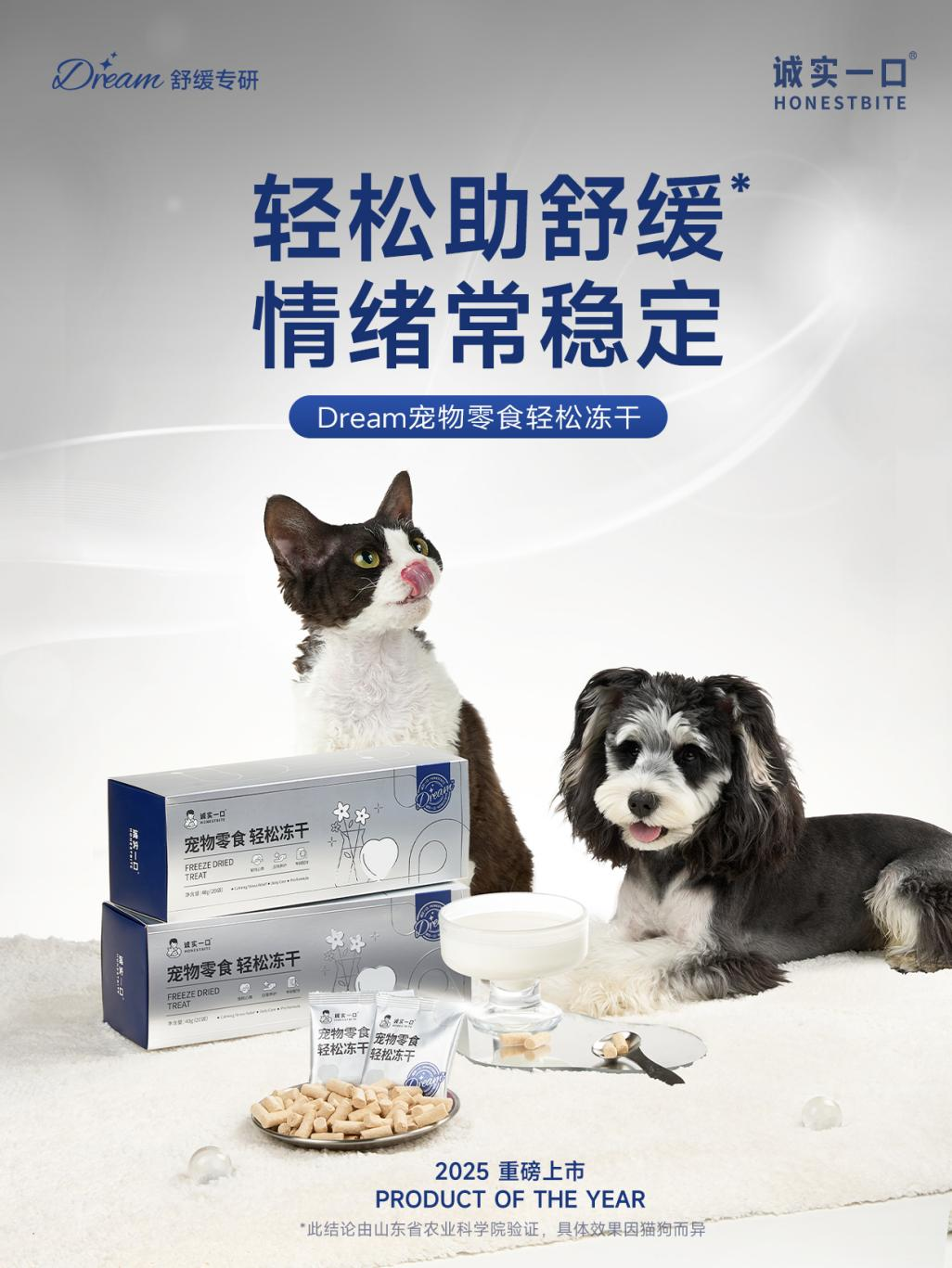 基于对宠物情绪的研究梳理,诚实一口联合山东农科院科学实测,推出Dream宠物零食轻松冻干。该产品富含三重有效成分,并添加专利舒缓成分Lactium®,天然无依赖性,能够有效减轻焦虑紧张,帮助宠物稳定情绪。配方严选天然食材,口感细腻便携,既是零食也是情绪安抚“神器”,让毛孩子时刻拥有满满的安全感。