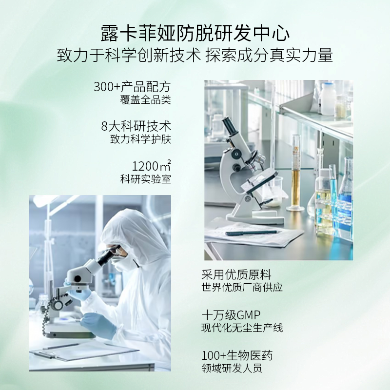 露卡菲娅品牌自有的防脱研发中心涵盖从基础研发、临床前研究、临床试验到新品上市的开发全过程,强大的实力与资源也为露卡菲娅防脱育发液的功效等带来了强有力的支撑。300+产品配方,8大科研技术,1200㎡科研实验室,采用优质原料世界优质厂商供应,十万级GMP现代化无尘生产线,100+生物医药领域研发人员......