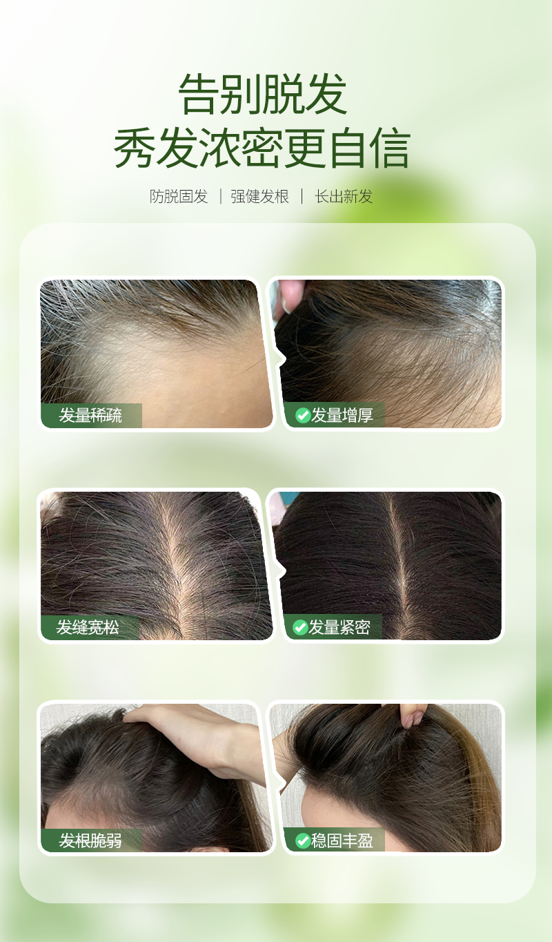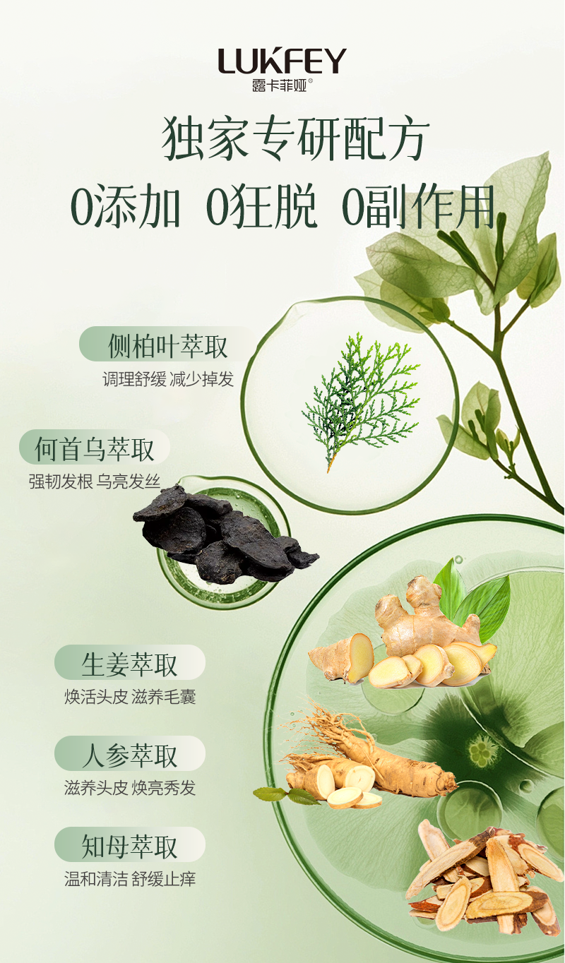 露卡菲娅防脱育发液产品由百余名科研专家历经10余年的研究,精选上乘何首乌、当归、女贞子、侧柏叶等多种草本植物萃取而成,富含多种防脱、育发、密发所需的微量元素,能将营养物质渗透入毛囊内部,改善毛囊根部的血液供应,解除毛囊内外压力,疏通毛囊,诱导新发生长,由里而外滋润头发,使头发浓黑亮密。同时含有最匹配头皮环境的、高功效的独家专研生发因子成分,可以持久强韧发根,促进头发的新生。