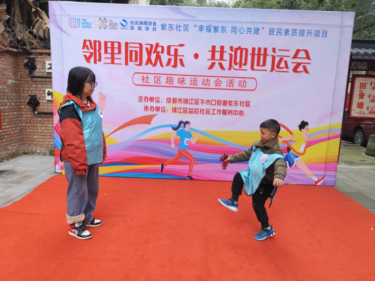 为积极响应成都世运会的号召,激发社区居民对体育运动的热爱,2025年3月29日,紫东社区开展“邻里同欢乐,共迎世运会”社区趣味运动会,旨在鼓励居民们走出家门,投身体育运动,提升身体素质,以健康的体魄面对生活的挑战。同时,活动也为邻里间搭建了交流互动的平台,助力营造温馨和谐的社区氛围,传播积极健康的生活理念。