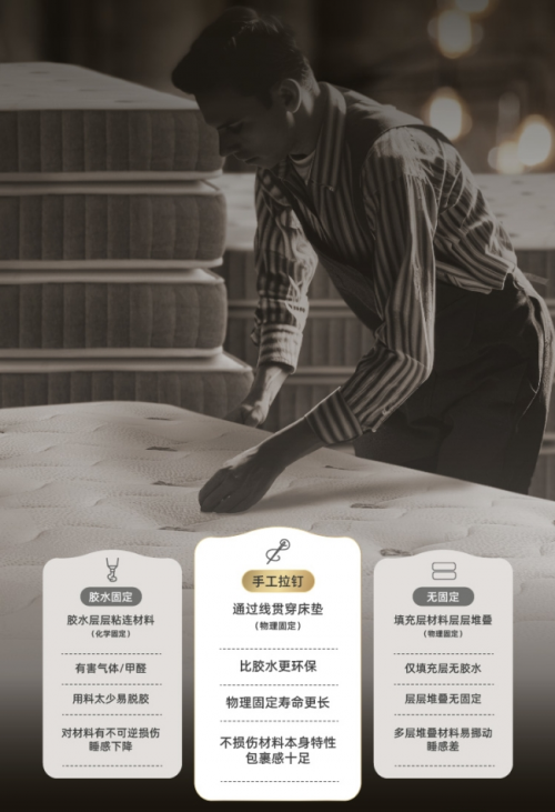 在材质选择上,雅芳婷太极床垫严格把关。与传统床垫依赖胶水黏合内部材料的方式不同,雅芳婷太极床垫采用了英国传统拉钉工艺,从面部到底部进行拉钉固定,无胶水黏合,大大降低了由胶水可能产生的甲醛等有害物质的风险,让消费者睡得更加安心。