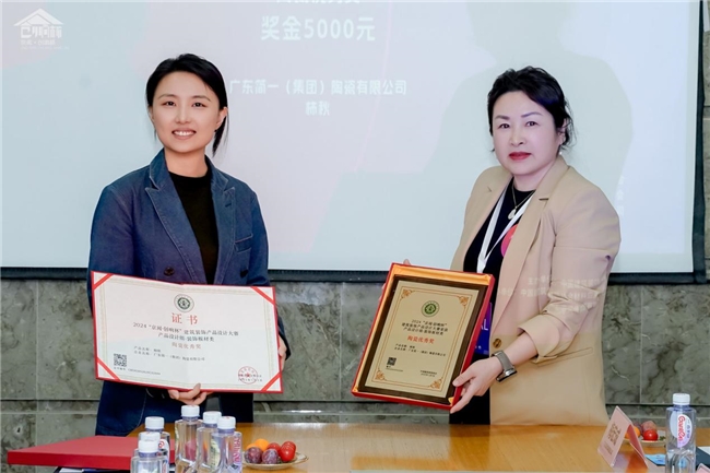在此次大赛中,简一凭借匠心独运的作品“柿秋”,荣获“产品设计组 - 装饰板材类陶瓷优秀奖”。梁宏瑀秘书长在简一展厅的参观过程中,亲自为简一颁发了奖牌、证书及奖金,以表彰其在设计领域的卓越贡献。
