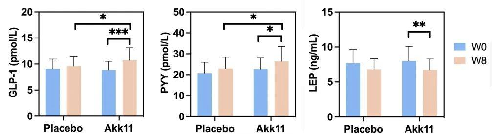 1、Akk11组血清GLP-1、PYY(饱腹信号激素)显著提升,LEP(饥饿激素)显著降低,证实其通过抑制食欲、增强能量代谢实现体脂优化;