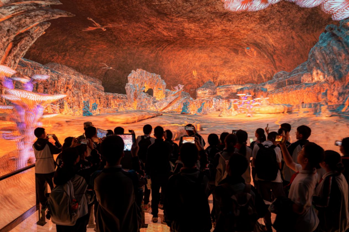 作为北纬28°喀斯特地貌的典型代表,兴文石海以“石海、天坑、溶洞”三大地质奇观闻名。景区此次创新推出全国首个“行进式躺游演艺”《石海长歌》,游客可置身于亿万年地质变迁的实景中,通过光影科技与自然景观的融合,感受地球脉动与生命史诗。同时,依托亚洲最大溶洞群打造的“仙宴洞天”沉浸式溶洞餐秀,将苗族风情与美食文化结合,为游客开启舌尖上的奇幻之旅。