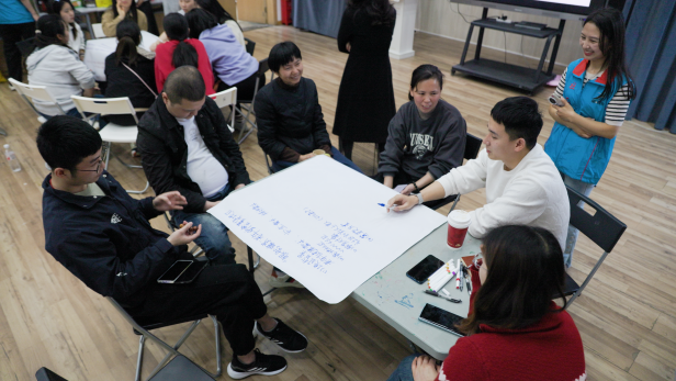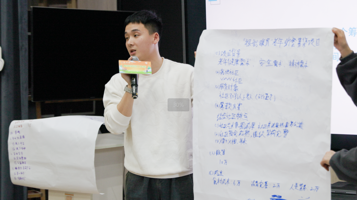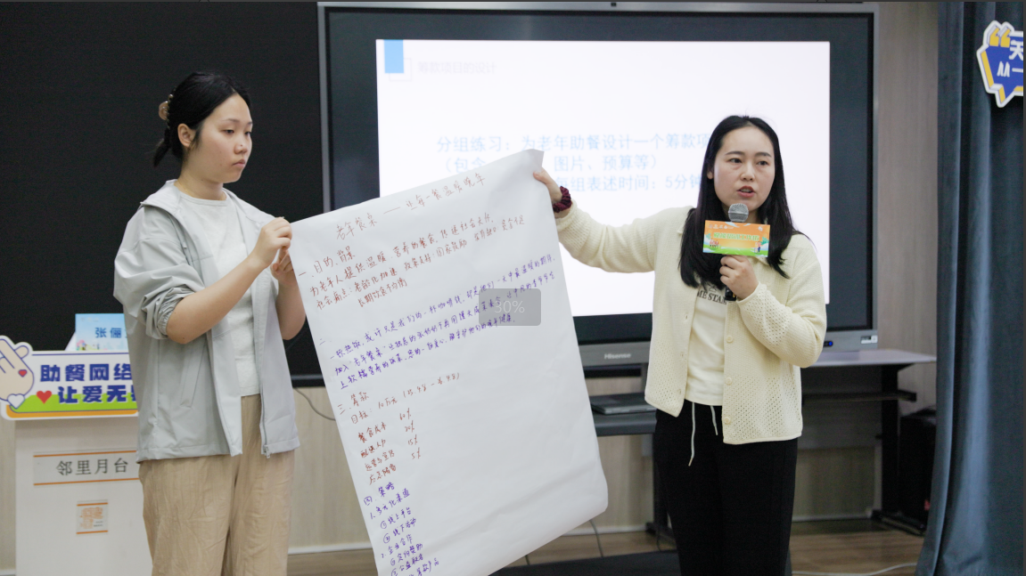 在分组研讨环节,各助餐点代表分为两组展开头脑风暴。一组提出“老年餐桌——让每一餐温暖晚年”的老年助餐筹款项目,通过线上平台与线下活动相结合,设计“爱心饭卡”与“月捐计划”精准筹款产品以实现筹款目标;二组则探讨了联动社区商企资源与能人达人,开展“义卖”与“义拍”,在筹集善款的基础上满足老年群体的精神文化生活与社会交往需求。讨论过程中,项目组专家全程参与指导,帮助各团队梳理思路、完善方案。