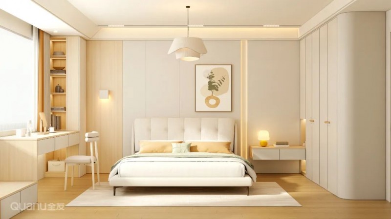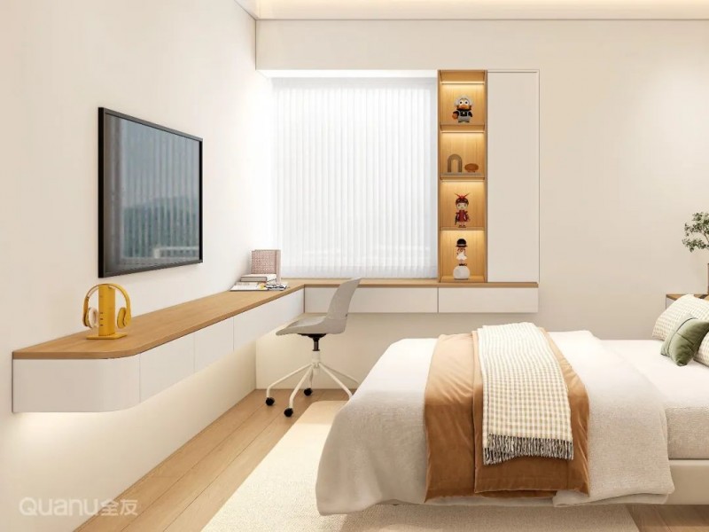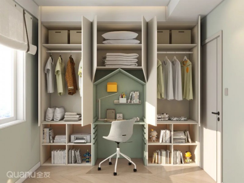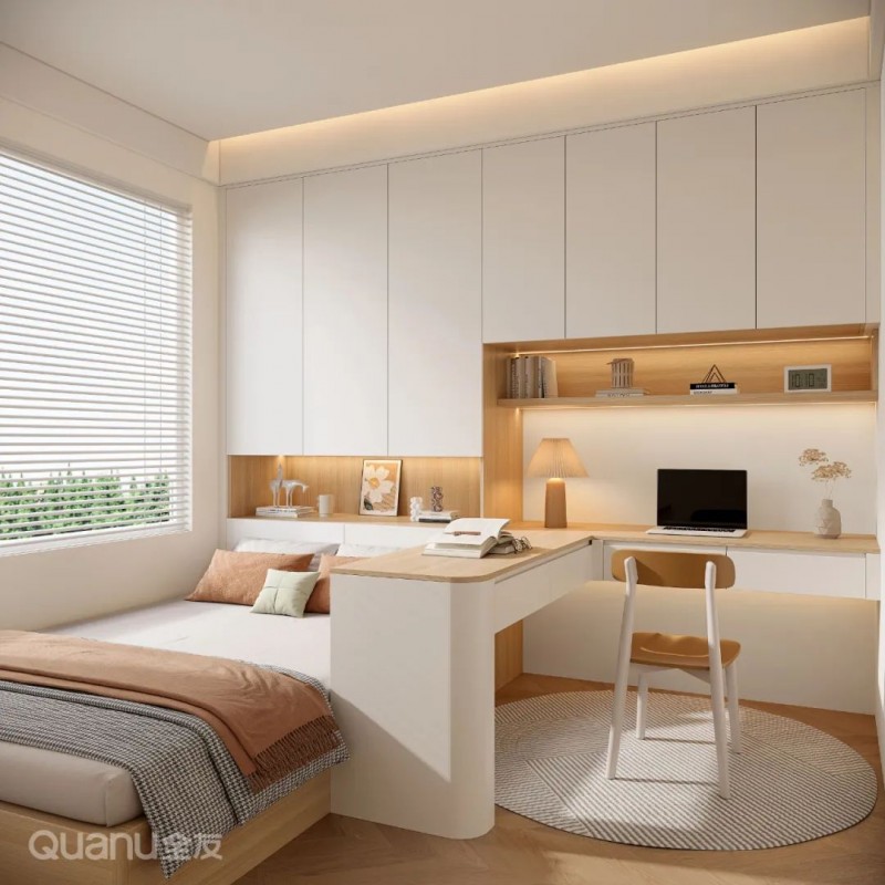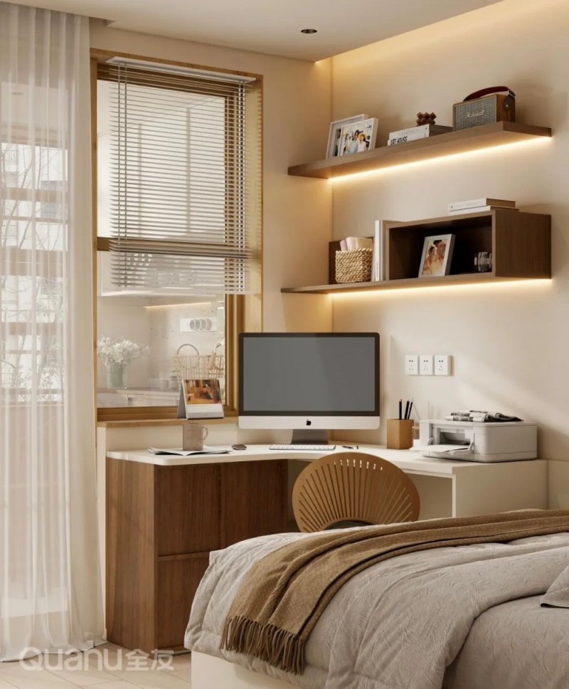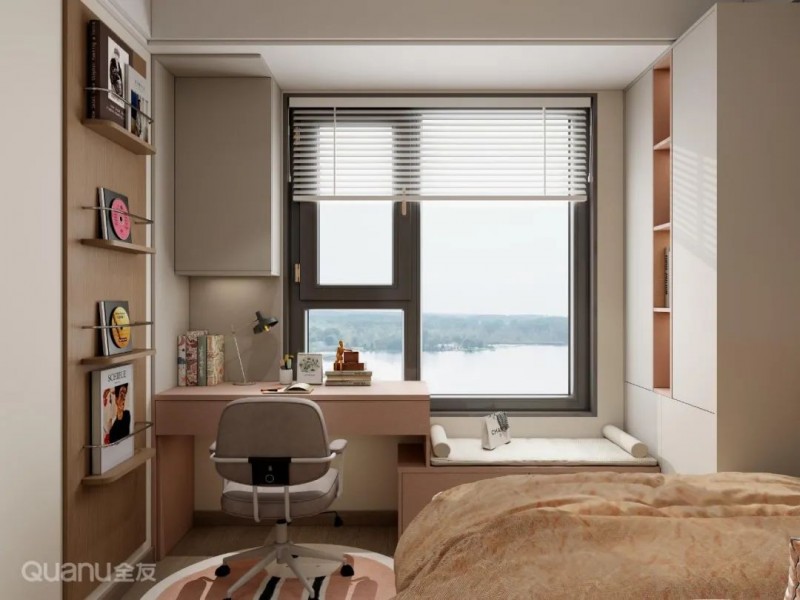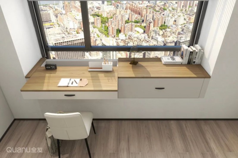 ③此外,还可以将书桌柜靠墙设置垂直于飘窗之上,或将抽屉桌面嵌入飘窗做可推拉设计,结合壁龛或矮柜,满足不同家庭的实际需求。