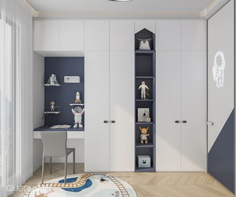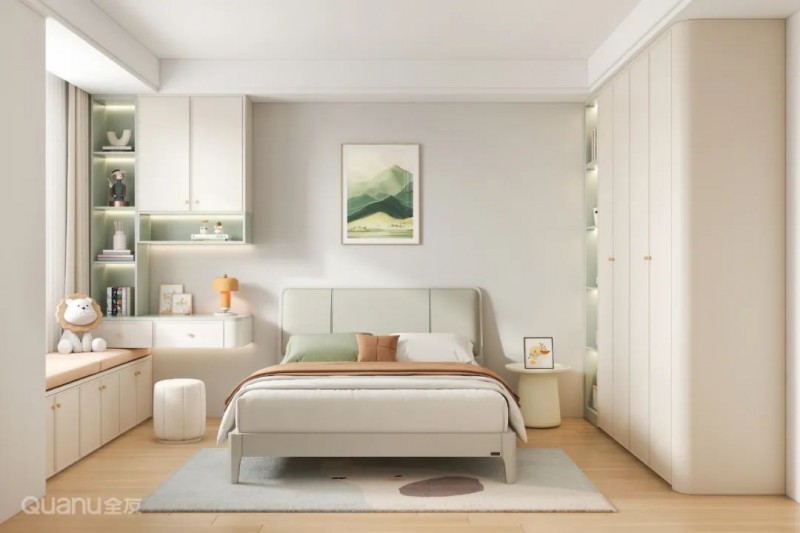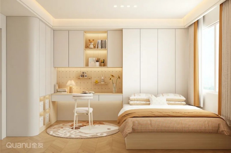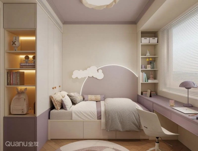 ②可根据儿童房开间、进深情况,在床尾或床侧定制一字型衣柜书桌组合,使空间布局更为规整和谐,在视觉上还有拓宽空间的效果,营造开阔明亮的室内氛围。