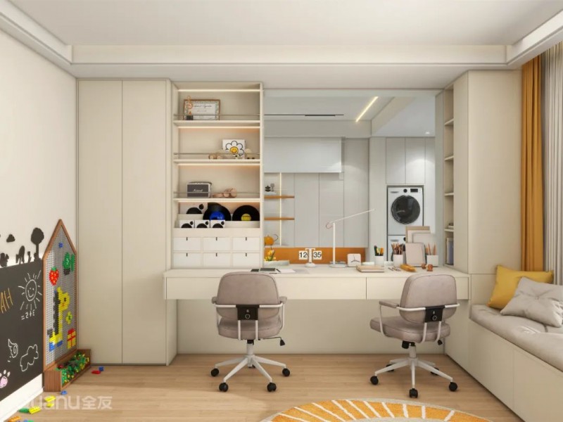 ①沿床尾墙面定制书桌,桌面长度根据儿童房空间调整,上方搭配吊柜、隔板,下方设计抽屉、矮柜,可满足双孩学习或家长伴读等需求。