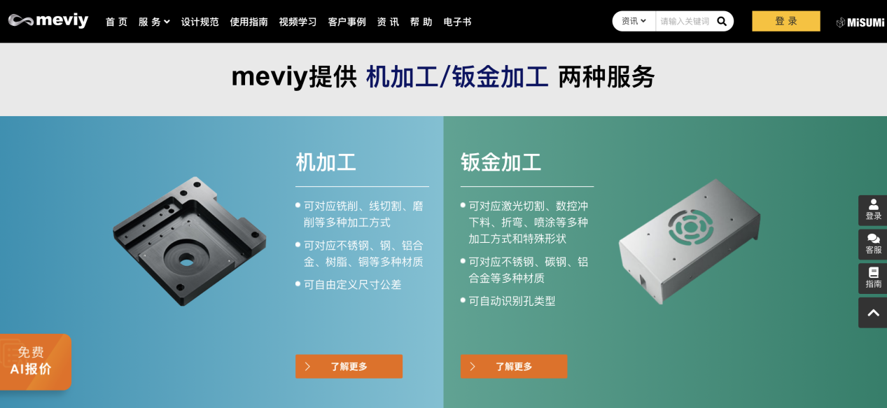 机械设计师、工业设计师要接触各种各样的钣金零件、机加工零件,不单要会画图,还需要进行报价。在进行非标件报价时,企业想要降本增效,就需要综合考虑时间成本、沟通成本等,选择快速且便捷的报价方式。基于以上考量,米思米适时推出meviy非标零件AI智能报价平台,仅需“上传3D数据、设置报价条件、显示报价和交期”3步,最快1分钟就能免费获得报价。不仅如此,平台还提供了诸多设计、机械有关的知识,从专业角度引导设计师快速入门行业。