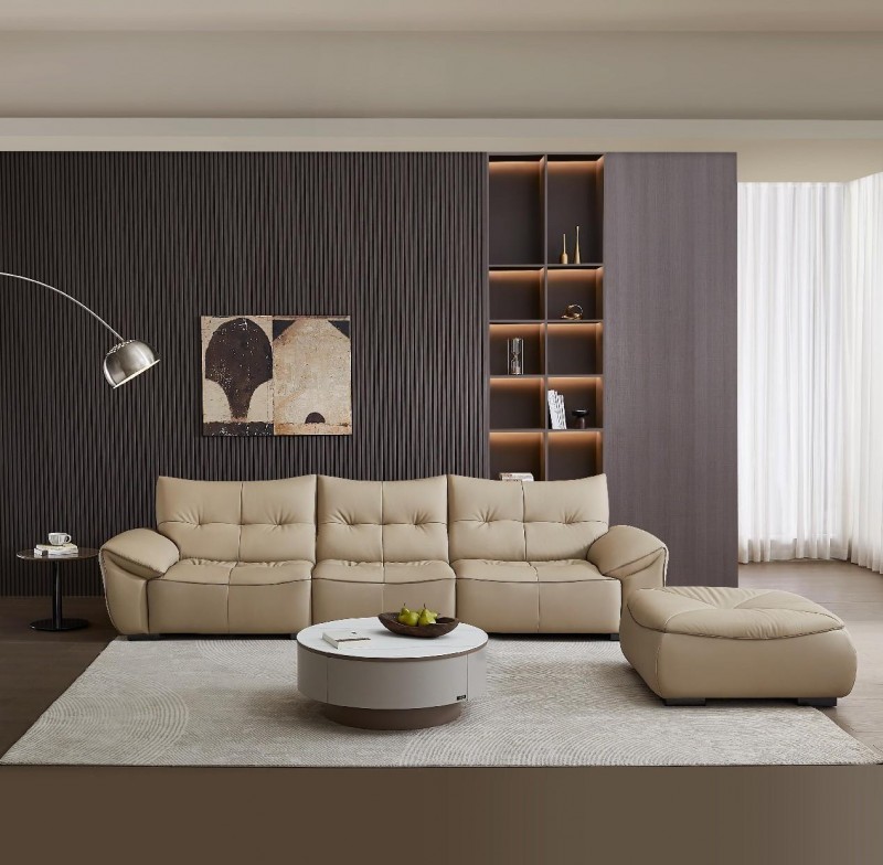 面料甄选进口头层牛皮,荔枝纹理质感十足,色泽纯正,手感顺滑,耐折耐磨经久耐用。加宽座深搭配大象扶手软枕,靠包加高仰角,倚靠更舒适,坐卧随心切换。简约一字型搭配脚凳,扩大舒适区,自由组合拓展舒适场景。