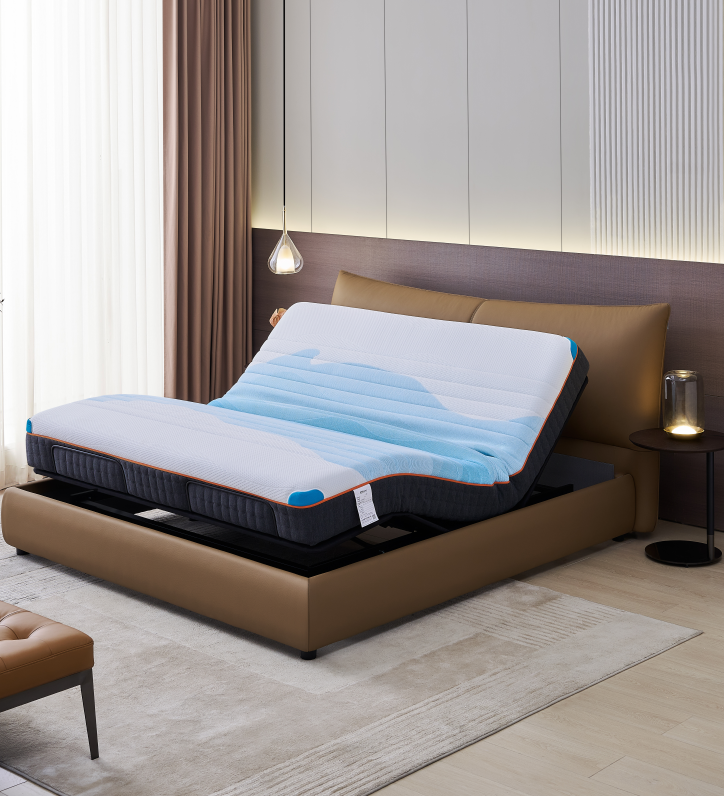 趣睡智能床,配备6大智能模式,随心调控,观影阅读尽享舒适。前后双电机设计,背部支持0-60°调节,腿部0-45°调节,实现精准分区操控。支持智能遥控与手机蓝牙双控制方式,智能体验再升级。床架采用坚硬碳素钢材质,搭配德国进口OKIN电机,提供强劲支撑,动力十足,档位切换顺滑无阻。床屏设计优雅,C形弧线自然流畅,尽显摩登格调。面料选用进口头层黄牛皮,质感温润厚实,纹理细腻自然。靠包挺阔,内填恒压高弹海绵,软弹包裹,带来满满安全感。