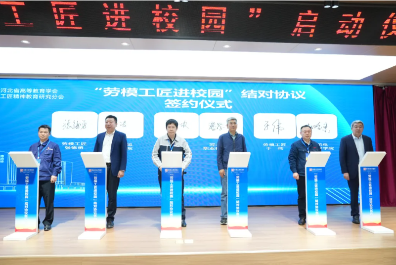 河北机电职业技术学院、河北软件职业技术学院、唐山海运职业学院作为河北省高等教育学会工匠精神教育研究分会会员单位代表分别与劳模工匠代表于伟、张海波、张德勇签订“劳模工匠进校园”结对协议。