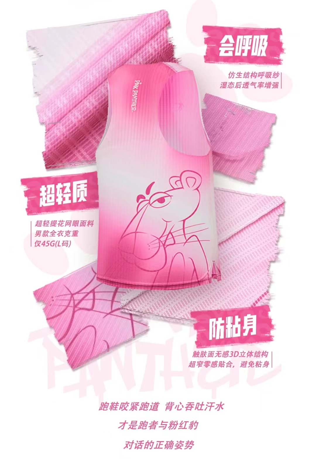 与跑鞋配套推出的还有飞影系列「呼吸纱」跑步背心,同样融入粉红豹元素,满印设计增添潮流感。该背心主打”超轻、透气、防粘身“三大特性,适合日常训练或比赛等场景。