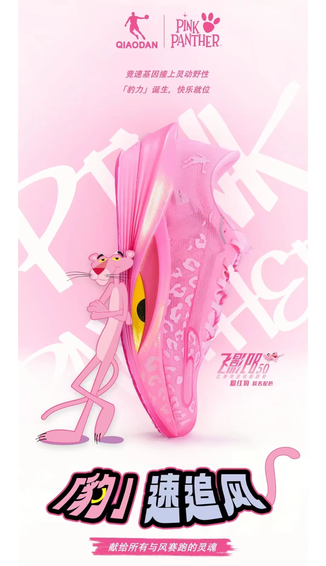 飞影PB5.0是中乔体育飞影系列的最新竞速碳板跑鞋,此次联名款在性能、设计上进一步优化。鞋身采用粉红豹纹设计,鞋舌点缀钻石元素,鞋侧带有标志性豹眼图案,既突出联名特色,唤醒不少人的童年DNA,又保留专业跑鞋的竞技属性。