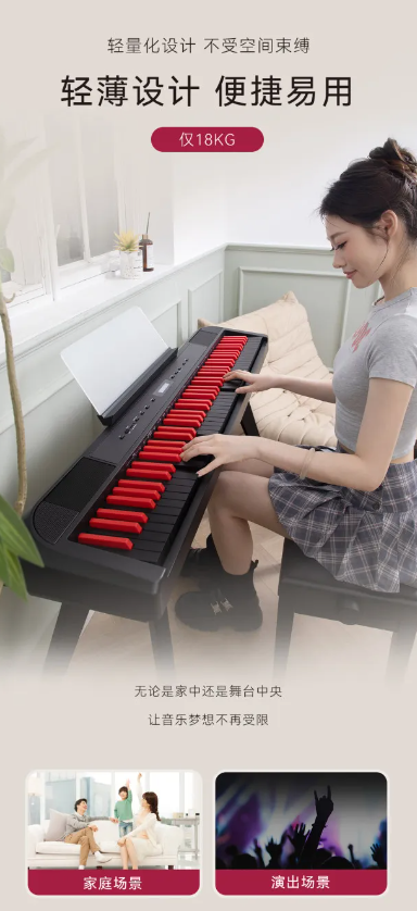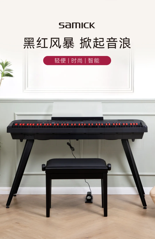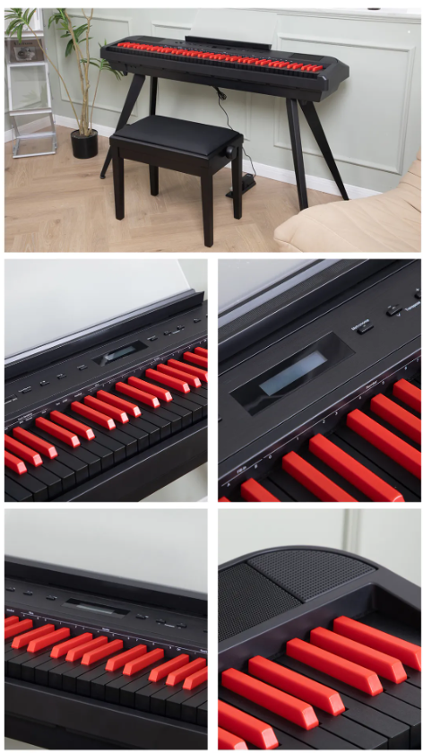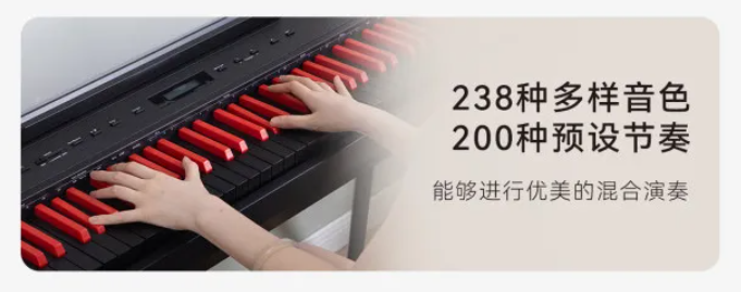 配备了88渐进式逐级配重键盘,从低音区到高音区的重锤键感由重到轻,其精准细腻的触感仿佛置身于真正的三角钢琴钢琴前,尽情释放音乐才华,感受音乐的无限魅力。同时它所采用的黑檀木质感黑键和磨砂质感红键,既让手感更加细腻、还原真实钢琴的触感,又能实现防滑功能。