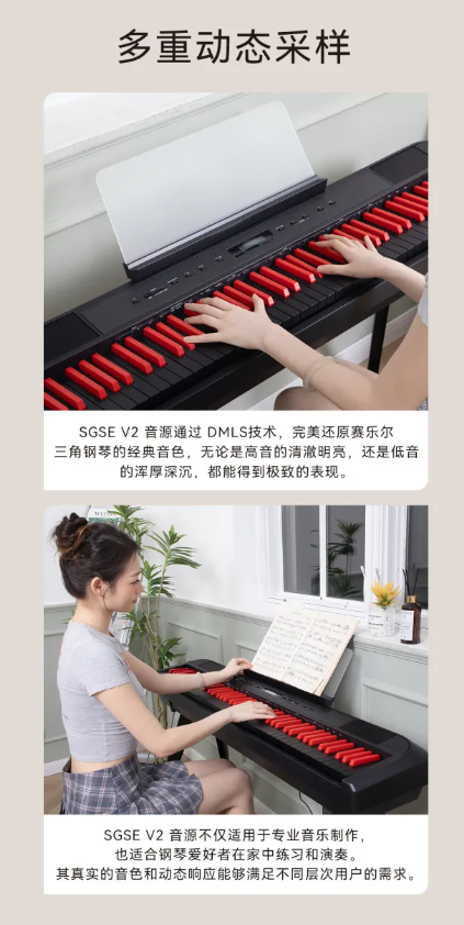 在音质表现上,这款数码钢琴运用先进的多重动态采样技术,精准还原大三角钢琴那极为丰富的音域。其音色呈现出细腻质感,每一个音符都能清晰展现出丰富层次,为演奏者与聆听者带来宛如亲临其境般、层次验。