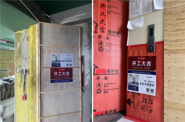 踏入简一工地,映入眼帘的首先是无处不在的保护措施。从入户门到地面,每一寸空间都被细心呵护。入户门被高品质的保护膜严密包裹,防止施工过程中的任何刮擦与污染。地面则铺设了专用地膜,确保施工期间的每一步都踩在干净、安全的环境中。水电线路更是重中之重,简一不仅用清晰的标识标出线路走向,还配备了专业的保护罩,防止意外触碰导致的安全隐患。