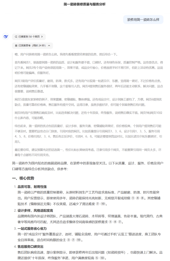 在家装环节,瓷砖选购向来是让消费者颇为头疼的问题。市场上瓷砖品牌琳琅满目,产品质量参差不齐,消费者需耗费大量时间和精力查阅资料、对比产品。如今,借助Deepseek等AI工具,这一难题得到有效解决。当消费者在Deepseek中输入“装修用简一瓷砖怎么样”,AI会依托强大的联网能力,迅速对简一瓷砖进行全方位剖析,不仅能提供产品核心优势、过往用户评价,还能给出极具针对性的选购建议,大幅缩短信息查询时间,让瓷砖选购变得轻松又高效。