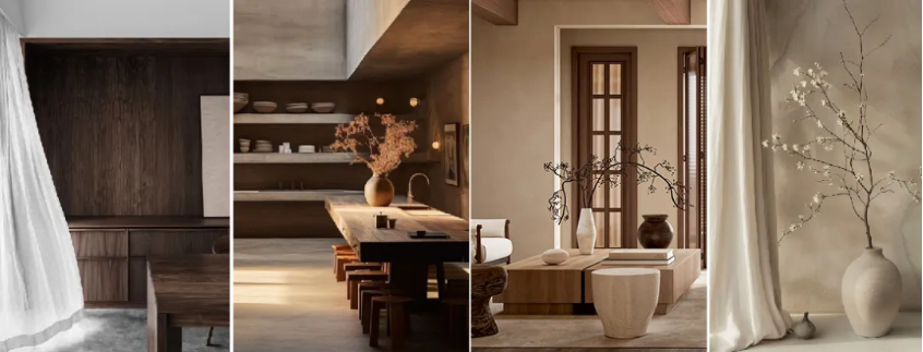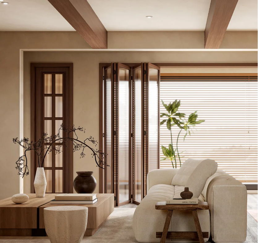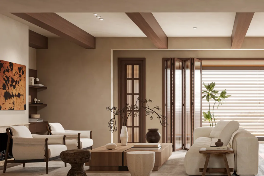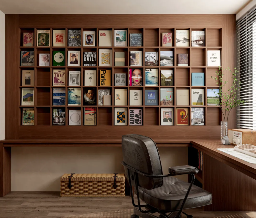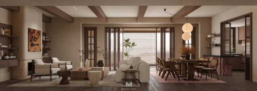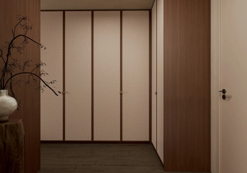 本期空间以东方美拉德为基调,将中古侘寂与东方禅意完美交融。胡桃木色与寻影布纹秋野铺陈出温润底色,在浓郁复古氛围中巧妙糅合现代设计语汇,于实用与意境审美间达成精妙平衡。