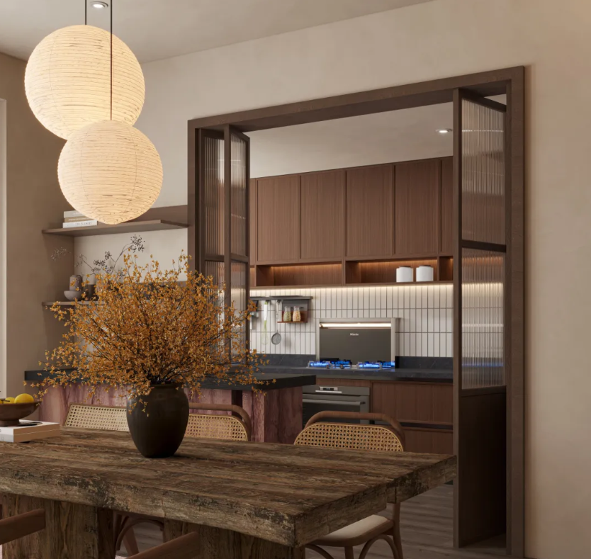 厨房借用半通透的复古折叠门巧作隔断,整体空间自然衔接过渡,隔烟不隔景。