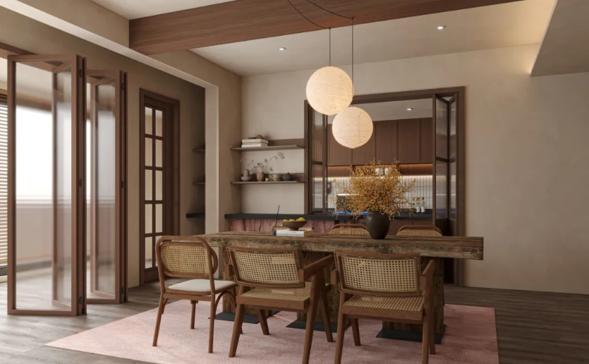 胡桃色与藤编元素交织相伴,自然气息浓厚的餐桌配上古香古色的花艺,于原木岛台上设置茶台,让诗意蔓延至三餐烟火里。