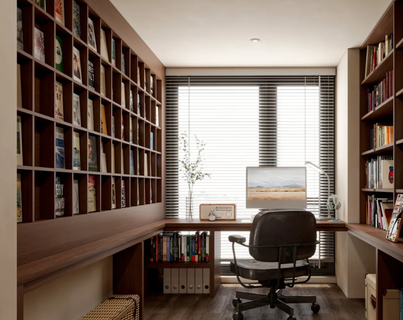 手作室两侧做贴墙开放收纳格,一键收纳主人的艺术藏品,底部镂空区还可容纳杂物。柜体延伸至靠窗侧做悬浮式书桌,工作和娱乐两不误。
