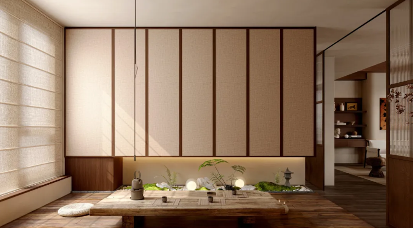 圆形编织坐垫搭配自然气息馥郁的木桌,布纹悬浮柜和百叶窗的注入,更是将中式禅意风之美演绎地淋漓尽致。