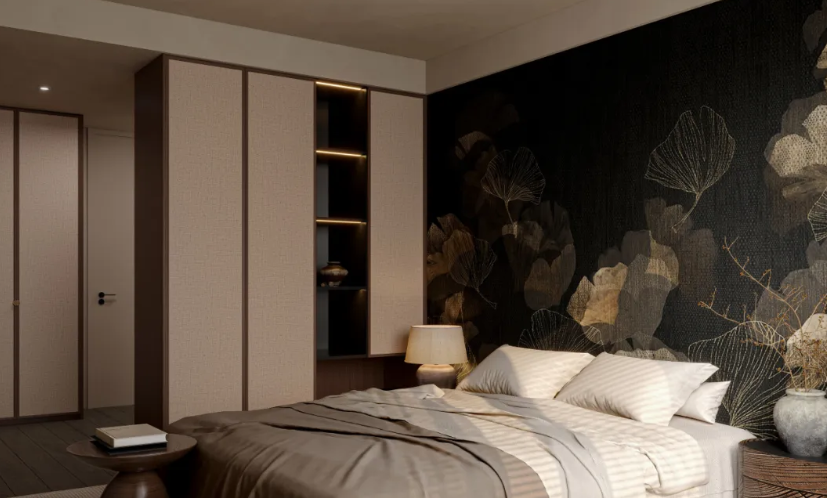 主卧做无主灯设计,搭配静谧沉静的背景墙纸,塑造柔和宁静的睡眠空间。分段式衣柜延伸出悬浮床头柜,满足收纳的同时又不失氛围感。