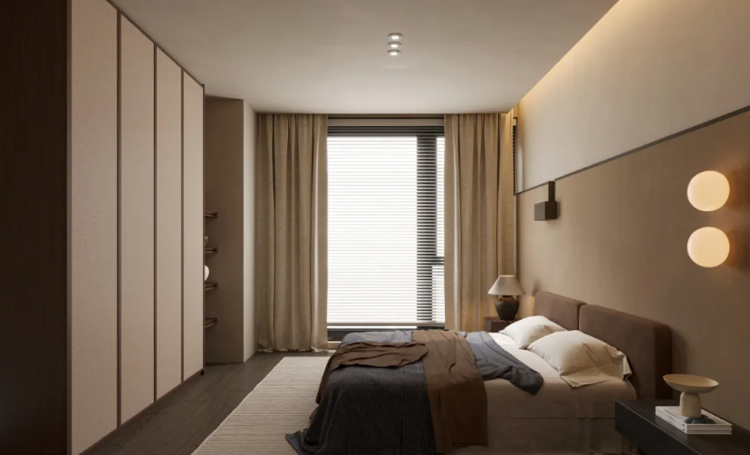 次卧以优雅的米棕色调为主调,践行极简理念,不加过多装饰。吊顶凹槽做内嵌灯带设计,智能调节灯光冷暖,赋予空间舒适高级的质感。