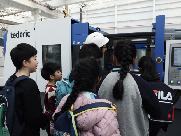 穿过井然有序的脉动线生产线,正在运作的注塑机引得孩子们驻足围观。他们近距离观察塑料制品的生产流程,了解注塑机的生产工艺及运行原理,切身感受现代化工厂智能制造的科技魅力。也许在那一刻,他们在泰瑞4.0智能工厂找到了“塑料制品来自哪里”的答案。