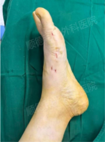 手术耗时也很短,仅1个多小时,只在左足患处各留下三个0.3cm的小切口,术中出血量少,术后恢复速度也更快。严格按照术前设计精准矫形,整个手术过程严谨、精细且高效。细致的诊查结合摄片综合判定,韦女士的情况可以通过该术式进行治疗。