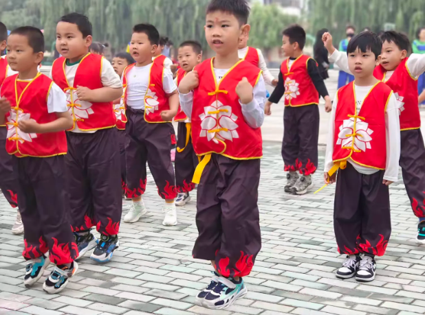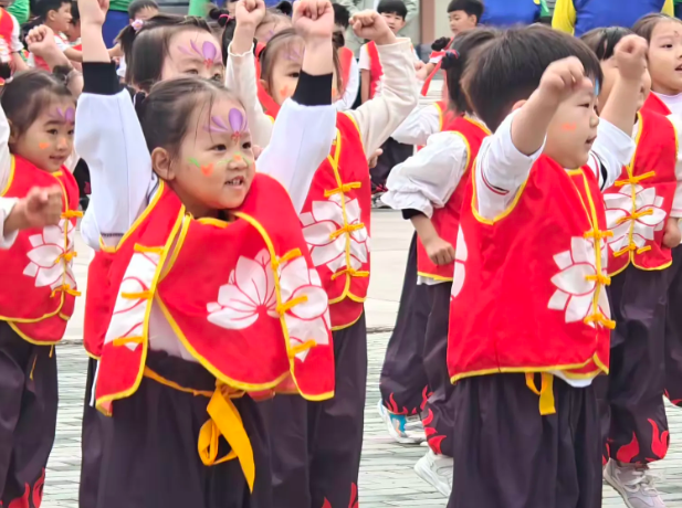 孩子们化身“小哪吒”,以团体操再现“闹海”传奇。他们用充满活力的动作传递着热血与激情,仿佛将神话中勇敢无畏的哪吒带进了现实。这场表演不仅是体能的展示,更是对坚韧、勇敢品质的生动诠释。