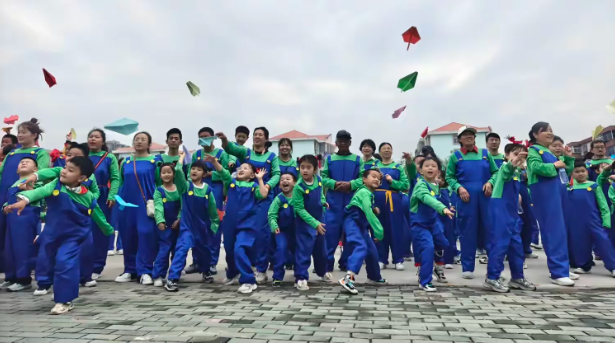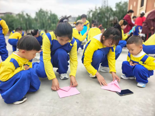 孩子们用力将手中的纸飞机掷向天空,五彩斑斓的纸飞机纷纷腾空而起,在蓝天白云下划出一道道美丽的弧线。